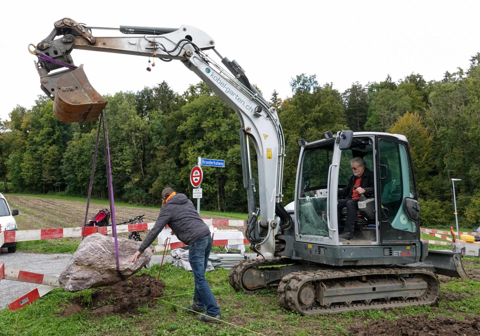Es besteht also eine grosse Chance, dass der markante «Grundstein» der Gärten mindestens für die zwei kommenden Dekaden an seinem Platz ruhen wird. Es handelt sich dabei um einen rotvioletten Melser Stein, den Vereinspräsident Franz Germann persönlich in der nordwestlichen Ecke des Areals platzieren durfte, mit Hilfe eines Baggers. Obwohl er erstmals in der Führerkabine eines solchen Gefährts sass, erledigte er seinen Job perfekt, assistiert von einem Mitarbeiter der Firma Kobel Gartengestaltung.