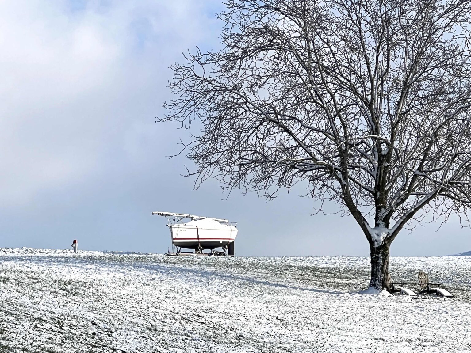 «Das Schiff scheint mitten auf der Wiese zu stehen. Es geht ihm gut, es fehlt ihm nichts. Und doch ist es am falschen Ort. Das Segel ist eingenommen, der Mast ist gelegt. Man hat sich gut darum gekümmert, und doch existiert es an seiner Bestimmung vorbei. So geht es einem doch gelegentlich im Leben. Man hat keinen Grund zum Klagen. Und doch stimmt etwas Grundsätzliches nicht. Man ist nicht in seinem Element», schreibt Benjamin Stückelberger, der dieses Foto kürzlich in der Meilemer «Luft» aufgenommen hat.