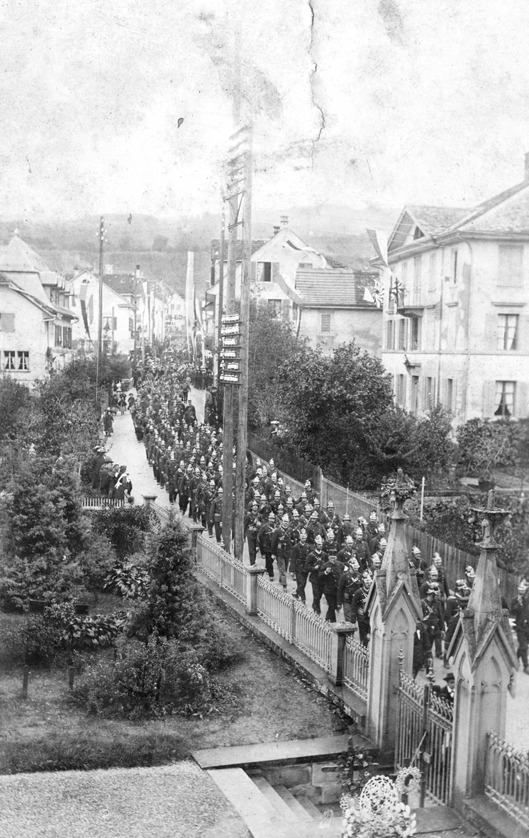 Durch eine beflaggte Kirchgasse bewegt sich um etwa 1900 ein langer Umzug von Feuerwehrleuten mit Pickelhaube, die hier wohl aus dem ganzen Bezirk, vielleicht sogar aus dem ganzen Kanton zu einer Tagung oder einem Fest zusammengekommen sind, samt zuschauenden Einwohnern. Das leider unscharfe und defekte Foto zeigt zudem einzelne Masten zur Stromversorgung (z.B. links aussen), aber auch zwei durch Querleisten verbundene Masten für Telefon-Anschlüsse, ohne dass jedoch schon Drähte zu erkennen wären (danke für die Auskünfte, Edi Mumprecht!) Rechts aussen stehen zwei neugotische Portalpfeiler zum Kirchen- und damaligen Friedhofgelände mit einer für seinen Zweck eher seltsamen Bepflanzung.