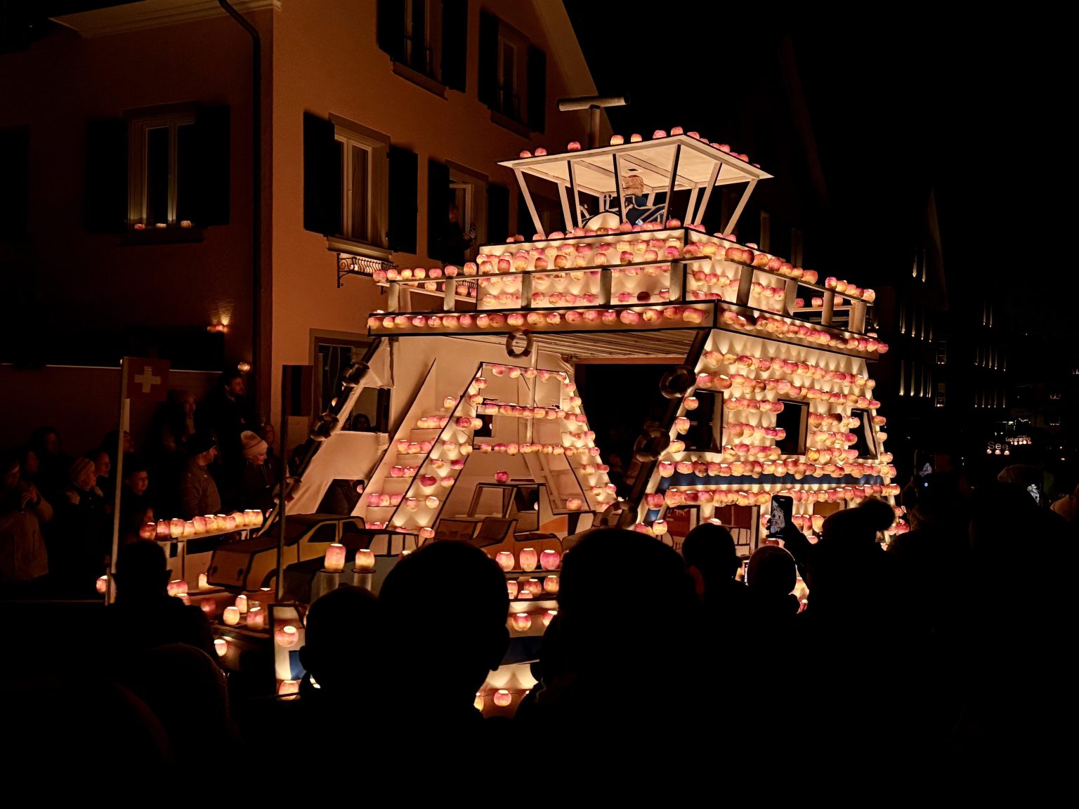 Besonders viel zu tun gab dabei das schönste und grösste Motiv, eine Zürichsee-Fähre, die mit auf der Ladefläche parkierten Papp-Autos punktete und an deren Steuerrad (eigentlich wäre es ja ein Joystick…) ein Kapitän mit Räbeliechtli-Kopf sass. Andere Motive wie ein kugelrundes Sparschwein, ein Otter, Schleckstängel oder das Porträt von Fussballerin Sydney Schertenleib wurden zwar ebenfalls bejubelt – aber am meisten Applaus von den Zuschauerinnen und Zuschauern am Strassenrand, die dicht an dicht hinter rotweissen Absperrbändern standen, gab es eindeutig für die Fähre.