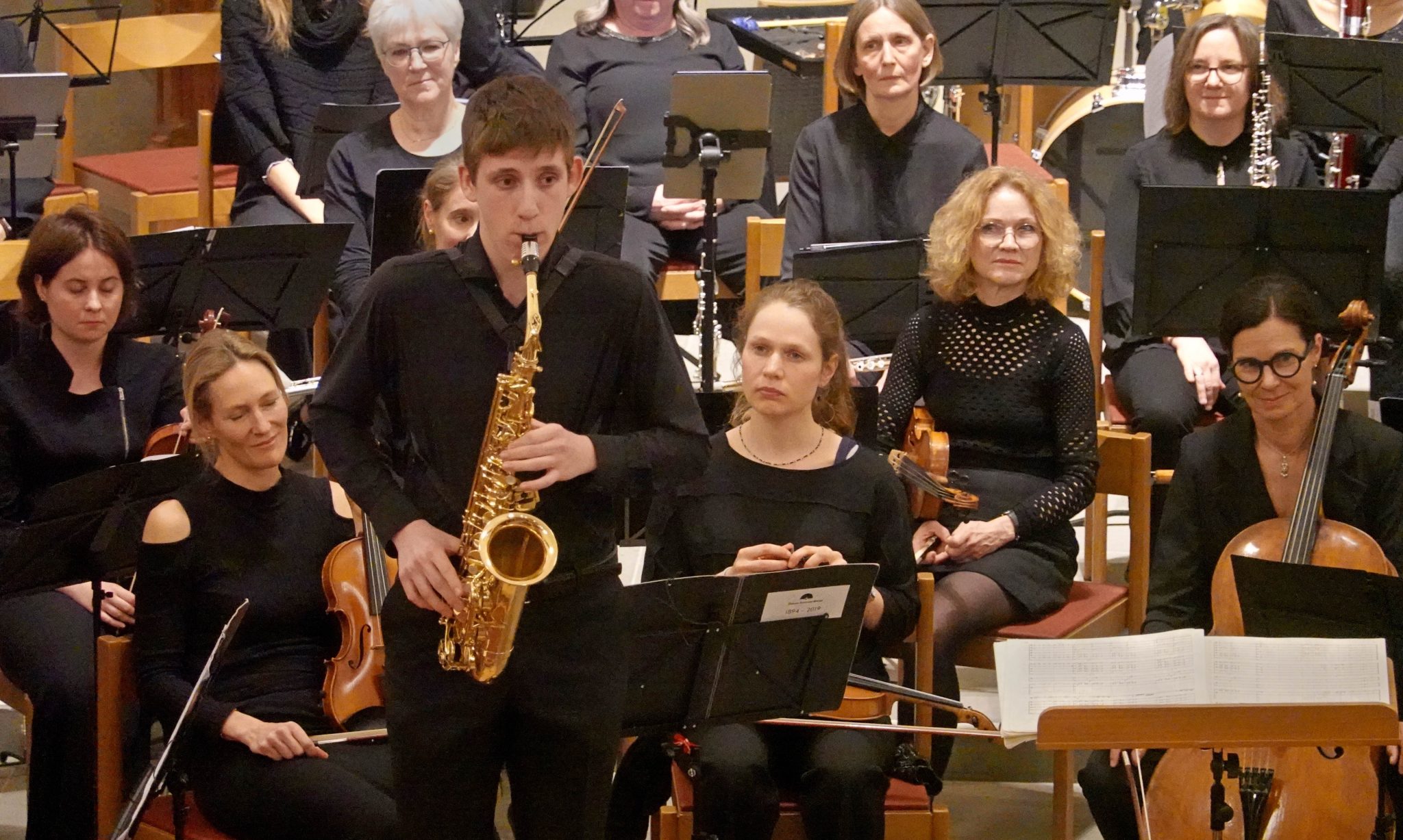 Sphärische Klänge fluteten den Kirchenraum, bevor das Saxophon mit einer sonoren Kantilene den Solopart der Rhapsodie für Altsaxophon und Orchester von Claude Debussy (1857 – 1918) einleitete. Flaviano Alder gestaltete mit fein abgestufter Dynamik und differenzierter Klangintensität die lyrischen und wuchtig die orientalisch beeinflussten Stellen. Der 16-jährige Saxophonist ist besonders von der Klangatmosphäre im kontrastreichen einsätzigen Werk angetan. Ihn begeistern «die schnellen und reibungslosen Übergänge, wie das Stück von ruhigen, ausdrucksvollen zu sehr virtuosen Stellen fliesst». Von der Abneigung des Komponisten gegen das Auftragswerk und vor allem gegen das ihm unvertraute Instrument war in der farbigen und geschmeidigen Darbietung jedenfalls nichts zu spüren.