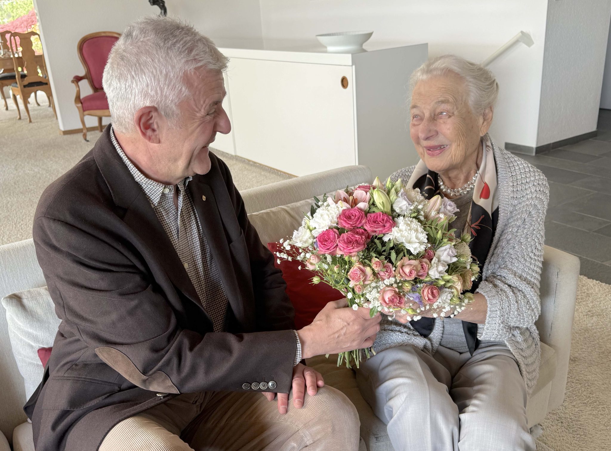 Katharina «Käthi» Vaterlaus hat sich sehr über den Besuch von Gemeindepräsident Christoph Hiller zu ihrem 100. Geburtstag gefreut und dankte herzlich für den wunderschönen Blumenstrauss. Sie kann in geistiger Frische auf ein langes, gutes Leben mit allen Höhen und Tiefen zurückblicken, umsorgt von einer grossen Patchworkfamilie, die ihr vor ein paar Tagen ein sechstes Urenkelkind in den Arm gelegt hat.
