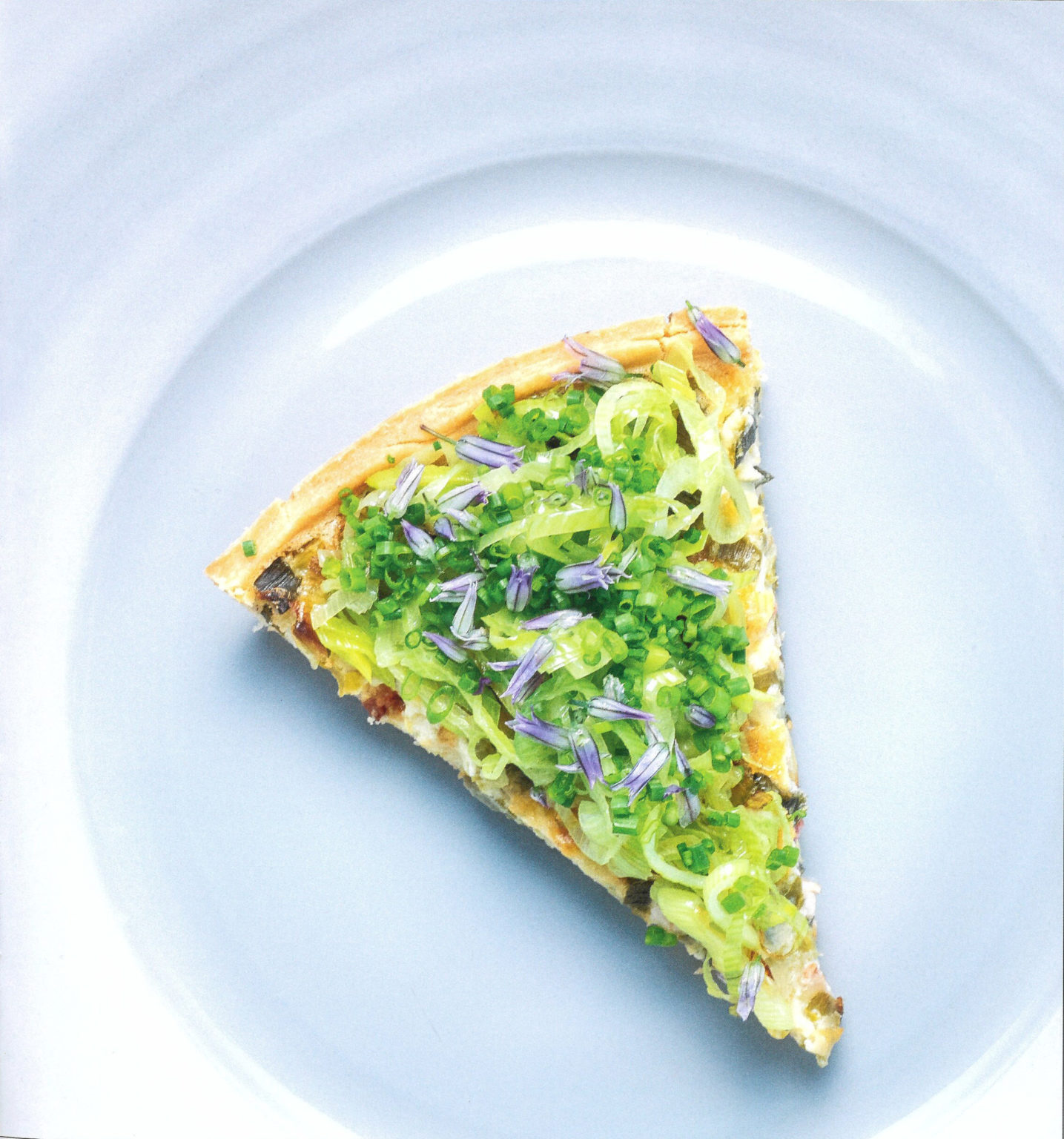Zum Anrichten die Quiche in Stücke schneiden und auf Tellern anrichten. Mit etwas in Öl gedünstetem und gut abgeschmecktem Lauch sowie mit Schnittlauch und allenfalls Schnittlauchblüten garnieren.