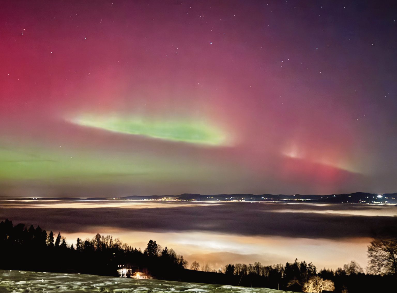 Diese wunderbaren Aufnahmen hat Bettina Elmer am Montagabend zwischen 22.30 und 23.00 Uhr auf dem Pfannenstil gemacht. «Eigentlich war ich schon auf dem Weg ins Bett, als eine Meldung von meiner Polarlichter-App aufgeploppt ist», erzählt Bettina Elmer. Nach einem kurzen Check  der Webcam wegen des Nebels, habe sie sich sofort in warme Kleidung gestürzt und sei losgefahren. «Und dieses Mal hatte ich wahnsinniges Glück! Wie oft stand ich schon dort und es war trotz halbwegs gute Prognosen nichts zu sehen…»