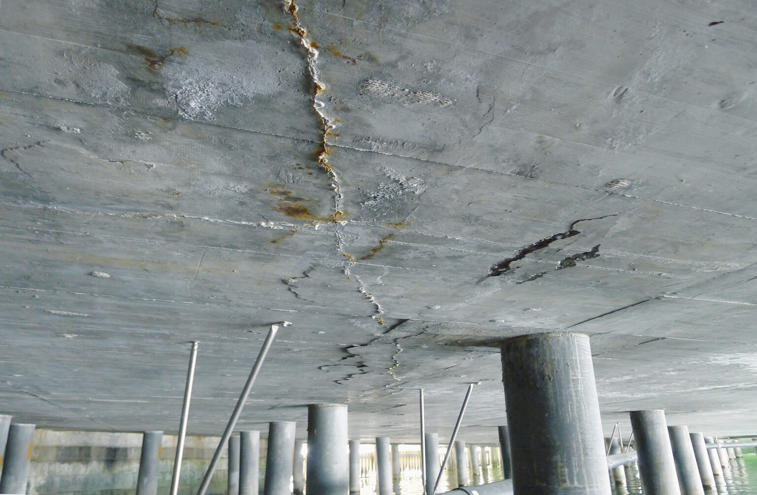 Bei der Warteraumplattform in Meilen handelt es sich um eine im Jahr 1969 erstellte Flachdecke, die über Pfähle und Ufermauern im Seegrund verankert ist. 1999 wurde die Plattform instandgestellt und erweitert. Dabei wurde unter anderem ein 11 Zentimeter starker Betonbelag auf der gesamten Platte erstellt, bei dem es sich um eine Verstärkung der ursprünglichen Betonplatte von 1969 handelt. Dieser Betonbelag weist heute eine Vielzahl von ausgeprägten Rissen auf. «Sie wurden im Zuge einer Sofortmassnahme im Dezember 2021 grösstenteils ausgefräst und mit Heissbitumen vergossen», erklärt Thomas Maag.