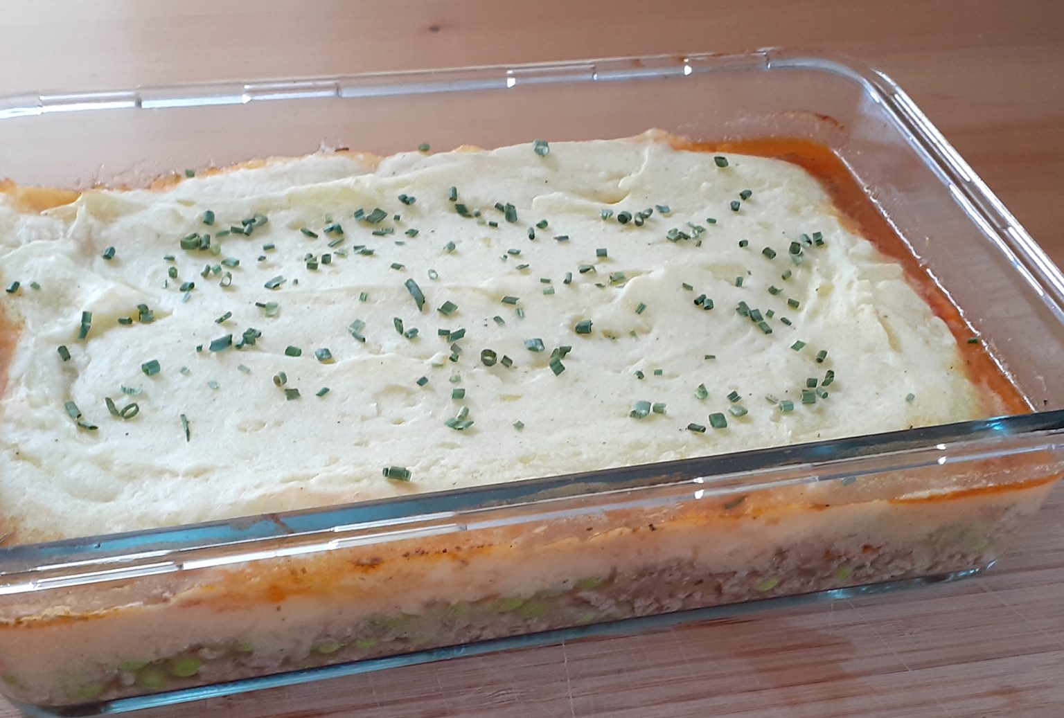 Die Füllung in die Auflaufform geben, mit der Kartoffelstockmasse bedecken und 25 – 30 Minuten bei 180 Grad im vorgeheizten Ofen backen.